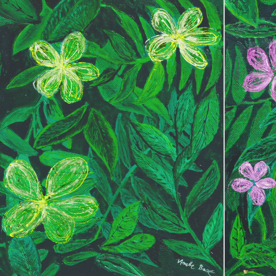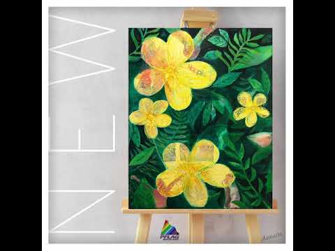 This series was painted in conjunction with the painting "Happy" that I created to benefit the PFLAG Organization, which provides resources to the LGBTQ+ community and their parents. The painting was inspired by Ellen Woods gorgeous flower photography. Leaves and pedals are interpreted in a graphic style testing out a new tool that I am totally obsessed with, the fine line applicator. It enables me to make extremely fine lines with liquidated paint. Incredibly fun to use. All the many layers of leaves as well as the petals were created that way. After doing the yellow one, I liked it so much, I decided to paint 2 more with different colors.